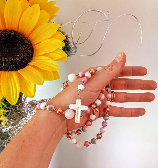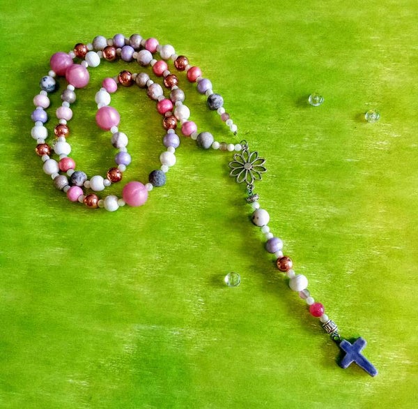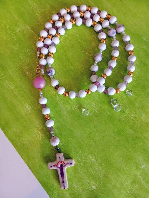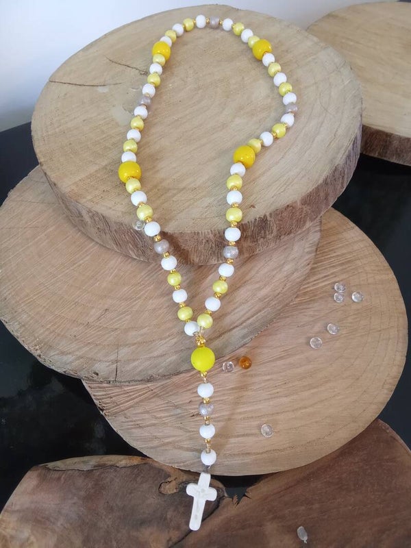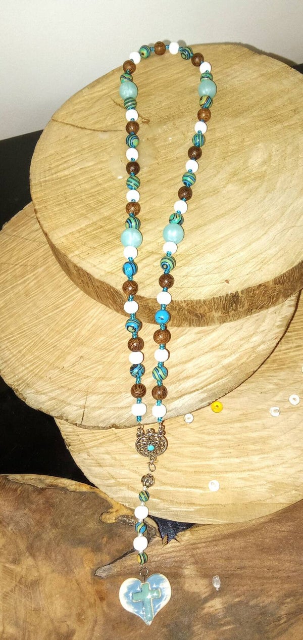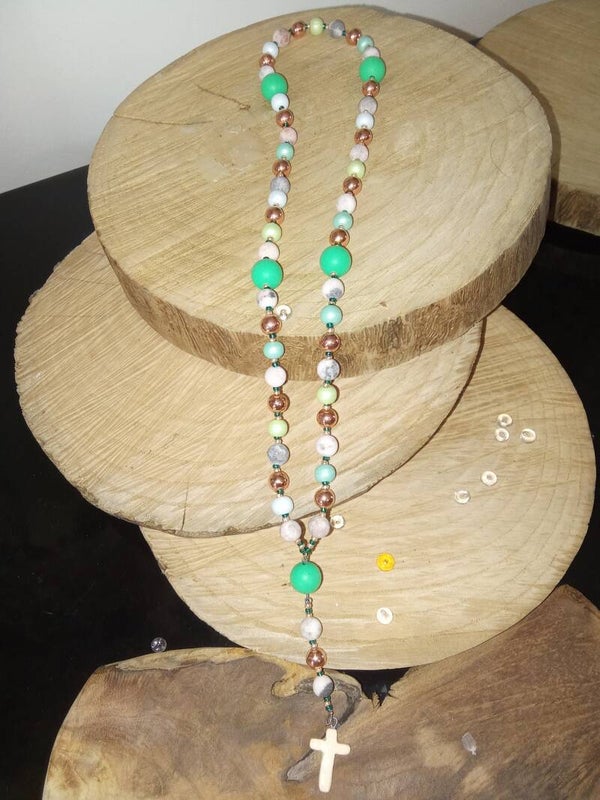 Très beaux chapelets colorés, modernes, uniques. Ils sont entièrement fait main avec des perles en bois, silicone, verre, des perles fantaisies et des croix en faience ou porcelaine.