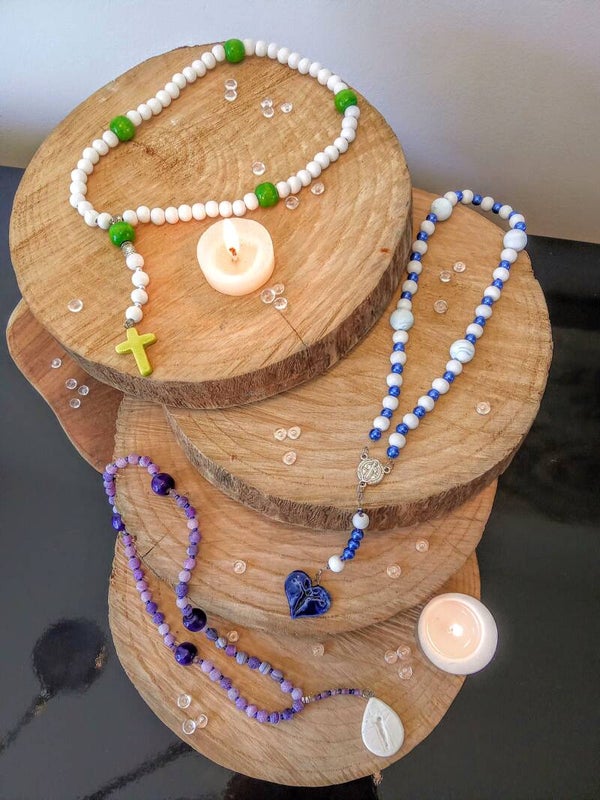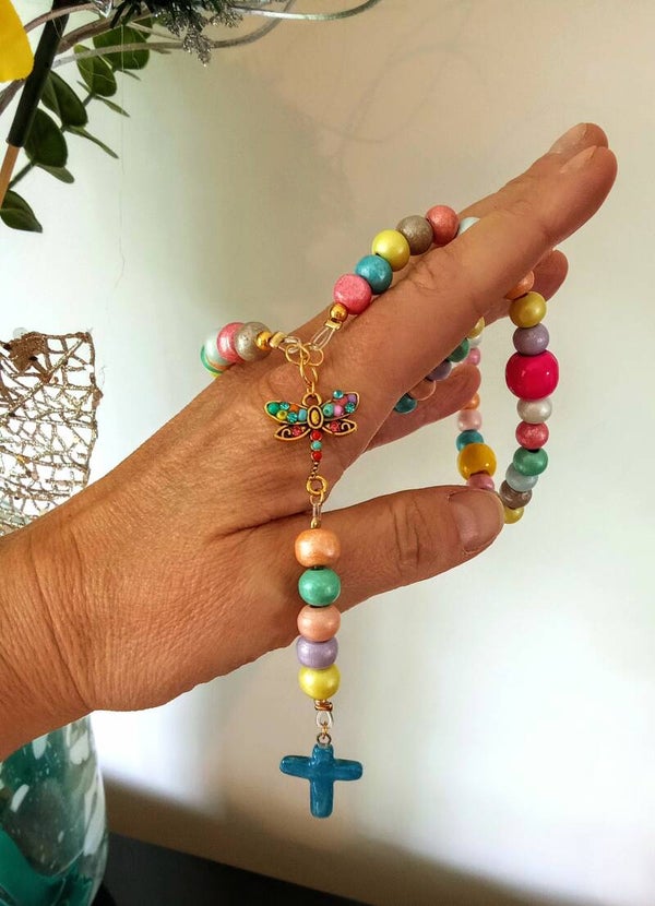 Jolis petits chapelets pour adultes ou enfants, facile à transporter ou à accrocher.Perles en bois pour la plupart sauf le rose et le mauve en perle de verre.
